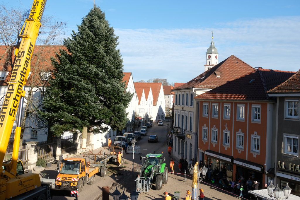 Bad Wurzach – Mithilfe eines Autokranes und zahlreichen helfenden Händen des städtischen Bauhofes konnte – traditionsgemäß am Mittwoch vor dem Weihnachtsmarkt – der große Christbaum am Marienbrunnen beim Rathaus in einem privaten Garten geschlagen und zum Zielort transportiert werden.