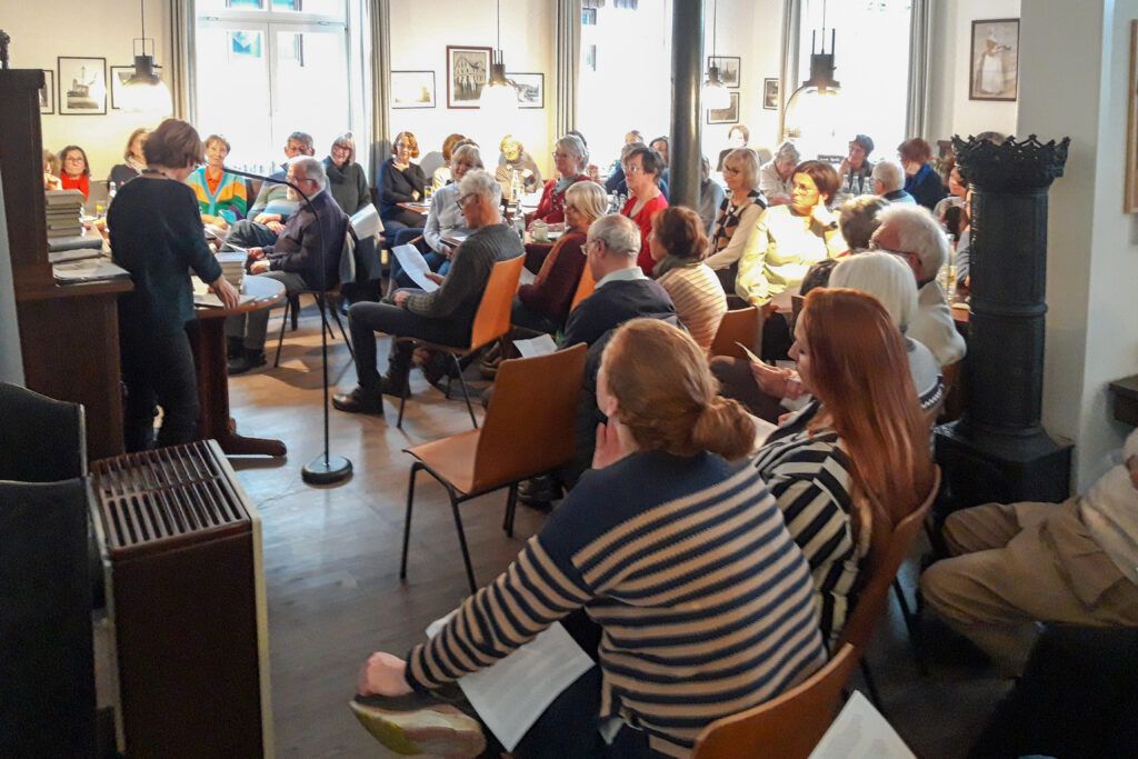 Leutkirch/Friesenhofen – Die Stühle wurden schon lange vor Beginn knapp. Wie gut, dass das Probenlokal der Trachtenkapelle nicht weit ist. Von dort organisierte die Dorfgemeinschaft Friesenhofen e. V. rasch zusätzliche Sitzgelegenheiten für die vielen, die zum literarischen Nachmittag der vhs Leutkirch und der Dorfgemeinschaft Friesenhofen e. V. in die Leutkircher Ortschaft gekommen waren.