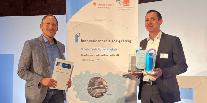 Ravensburg / Kißlegg – Die Wirtschafts- und Innovationsförderungsgesellschaft Landkreis Ravensburg mbH (WiR GmbH) hat im Februar 2025 zum 12. Mal einen Innovationspreis an Unternehmen verliehen, die sich mit ihren Produkten, Verfahren oder Dienstleistungen von der Konkurrenz abgrenzen, indem sie zukunftsweisende Technologien eingeführt haben. Einen Sonderpreis in der Kategorie „Nachhaltigkeit“ erhielt das Betonwerk Rinninger aus Kißlegg im Allgäu.