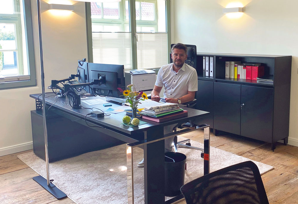 Seit Juni 2022 ist Marcus Schmid Bürgermeister von Erlenmoos. Mitte September, gut zwei Wochen vor der offiziellen Eröffnung des neuen Rathauses, stört gelegentlich der Lärm der Elektroarbeiten im Dachgeschoss das Gespräch. Der agile Einundvierzigjährige lässt sich nicht ablenken. Er ist zufrieden, dass die Generalsanierung des ehemaligen Gasthofs Ochsen termingerecht fertig wurde, es fehlen lediglich noch die Außenbeleuchtung, die Düse für den Brunnen vorm Haus und letzte Arbeiten an der Elektrik. Und das Beste: Die Baukosten blieben im Rahmen. „Wir sind bei 4,4 Millionen losgelaufen und landeten bei 4,8 Millionen. Das liegt daran, dass einige Leistungen dazu gekommen sind. Statt über eine Standard-Elektronik verfügen wir bald über ein so genanntes Bussystem“, freut sich der Jurist mit Blick auf seinen Schlüsselbund. „Damit können Beleuchtung, Jalousien, Heizung, Belüftung, Sicherheitstechnik sowie Schließanlage eines Hauses zusammengeschaltet und in einem Chip für jeden Benutzer angepasst werden. Dann brauchen wir diese ganzen Schlüssel nicht mehr.“