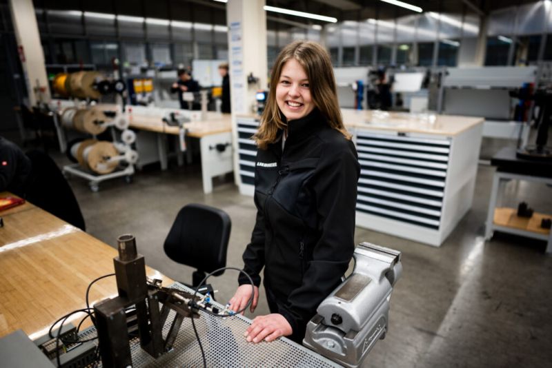 Rebecca Harnau in der Lehrwerkstatt – ihr Arbeitsplatz während der Semesterferien, in denen sie den Praxisteil ihrer Ausbildung zur Industriemechanikerin absolvierte. Fotos: Liebherr