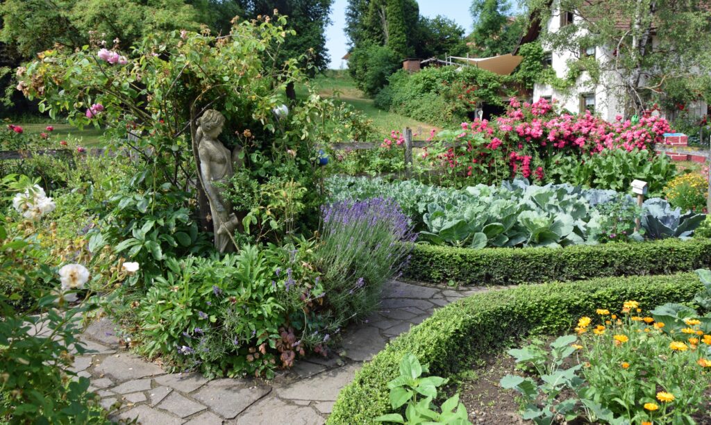 Himbeeren und schwarze Johannisbeeren (diese Vitamin-C-Bomben mögen ihre fünf Enkel besonders gerne) werden zu Marmelade verarbeitet, Holundersaft mit dem Apfelsaft der hofeigenen Streuobstwiesen gemischt, Ringelblumenauszüge kommen in Salbe, Johanniskraut wird in Olivenöl angesetzt. Kräuter dienen wie früher als Apotheke Gottes, auch mit ihnen kennt sich die fröhliche Frau gut aus. Kürzlich konnte sie beim Tag der Offenen Gartentür rund 200 Interessierte durch ihr buntes Reich führen.