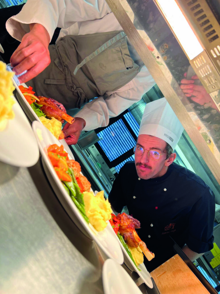 Seit Februar arbeitet er im Esszimmer. Und was lernt er nun dazu? „Für mich ist zum Beispiel das Pickeln neu, das Einlegen von Gemüse. Wir verwenden hier generell keine Convenience-Produkte, sondern schlagen auch die Mayo selbst auf. In der Lehre war ich nicht so viel auf dem Fleisch- und Saucen-Posten, Simon lernt mich hier super ein. Wir helfen uns gegenseitig und meistern als Team auch stressige Situationen gut. Unsere drei Azubis machen eine interessante Zusatzqualifikation, da bekomme ich einiges mit. Generell helfen mir auch die Grundlagen aus dem Studium, das ergänzt sich alles gut. Schön ist, dass wir hier auch ein Feedback von den Gästen erhalten. Kürzlich hatten wir ein Küchenfest. Jeder von uns verantwortete einen Gang mit Stationen im Lokal, wo wir alles angerichtet haben. Ein tolles interaktives Kochevent.“