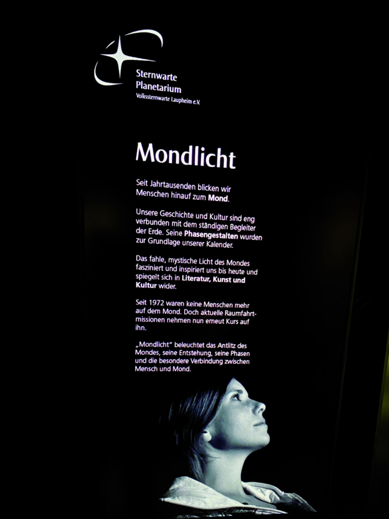 Das fahle, mystische Licht des Mondes fasziniert und inspiriert uns bis heute und spiegelt sich in Literatur, Kunst und Kultur wider. Seit 1972 waren keine Menschen mehr auf dem Mond. Doch aktuelle Raumfahrtmissionen nehmen nun erneut Kurs auf ihn.“ Sehr kurzweilig beleuchtet die neue Show „Mondlicht“ das Antlitz des Mondes, seine Entstehung aus de Erde durch einen Meteoriteneinschlag, seine Phasen und die besondere Verbindung zwischen Mensch und Mond. 50 Minuten, die sowohl für Menschen, die sich schon länger mit dem Weltraum befassen, Neues bringen aber auch Neulingen vieles verständlich machen. Auch Kinder ab etwa acht Jahren schauen gespannt nach oben und lauschen den Erklärungen, was etwa ein Meteoriteneinschlag mit dem Ende der Dinosaurier zu tun hat.