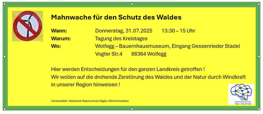 Wolfegg (dbsz) – Das Netzwerk Naturschutz Allgäu-Oberschwaben, das sich unter anderem gegen Windkraft im Altdorfer Wald ausspricht, ruft für Donnerstag, 31. Juli, zu einer Mahnwache auf. Diese findet von 13.30 Uhr bis 15.00 Uhr im Bauernhausmuseum in Wolfegg vor der Zehntscheuer aus Gessenried statt. Dort tagt zur selben Zeit der Kreistag.