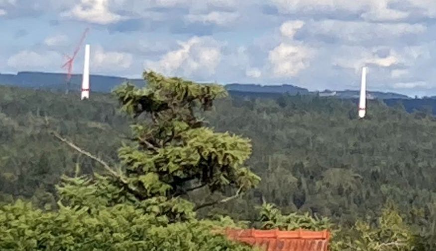 Zollenreute / Wolpertswende – Zwei der vier Windkrafttürme im Röschenwald wachsen derzeit in die Höhe. Die Aufnahme wurde am 4. September von Bruno Friedmann von Wolpertswende aus (Ortsmitte) mit dem Handy gemacht. Insgesamt werden im Bereich Zollenreute / Wolpertswende vier WKA mit einer Gesamthöhe von jeweils 246 Meter bis zur Rotorspitze (Nabenhöhe: 166 Meter) gebaut.