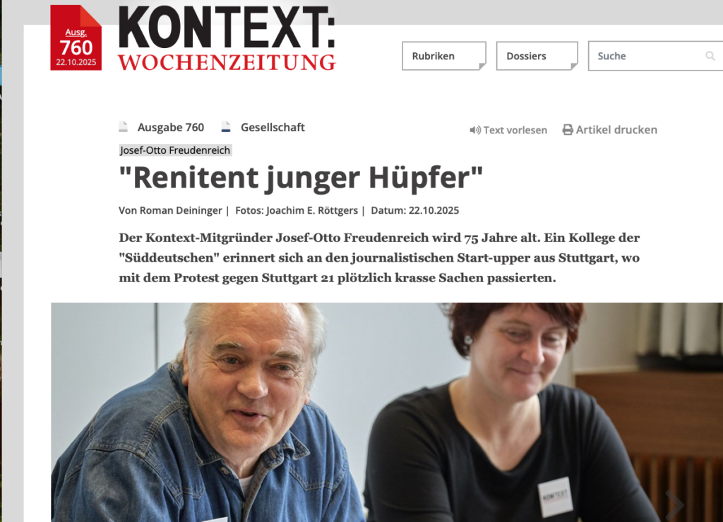 Bad Waldsee / Stuttgart – Josef-Otto Freudenreich, aus Bad Waldsee stammender Journalist, hat es jenseits seines heimeligen Städtchens weit gebracht: Er wurde Chefreporter der „Stuttgarter Zeitung“ und klopfte mit seinem Schreibstift den Mächtigen auf die Finger. Jetzt ist der Unbeugsame 75 geworden. Und nach wie vor mit seiner linksalternativen Internetzeitung „KONTEXT“ kritisch unterwegs.