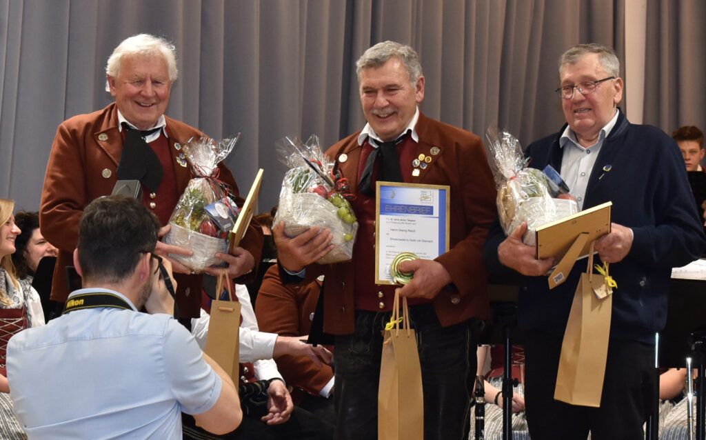 Willerazhofen – Die letzte aller Jubiläumsveranstaltungen zum 100-jährigen Bestehen der MK Willerazhofen (MKW) war am Samstagabend ein Doppelkonzert mit der Patenkapelle aus Heggelbach in der Turn- und Festhalle Willerazhofen. In diesem Rahmen konnte fast die halbe Kapelle mit Ehrennadeln ausgezeichnet werden, darunter acht 10-jährige, vier 20-jährige, fünf 30-jährige, vier 40-jährige und mit Martin Bareth, Georg Reich und Rupert Waizenegger sogar drei 60-jährige Mitgliedschaften. Dirigent Manfred Schuhmacher erhielt die Dirigentennadel in Gold mit Diamant für 25-jährigen Einsatz und großes Engagement als Ausbilder, Musiker, Initiator und Dirigent.