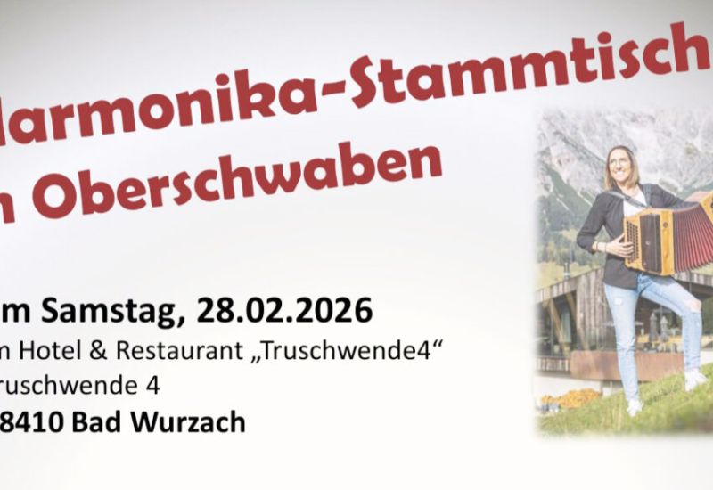 Truschwende – Claudia Herdrich macht wieder eine Veranstaltung rund um die Harmonika. Am 28. Februar findet ab 14.30 Uhr eine Harmonika-Ausstellung statt, bei der man viele Marken testen kann. Um 19.00 Uhr beginnt der Stammtisch, bei dem wieder kräftig musiziert wird. Das Ganze findet wieder im T4 in Truschwende statt.