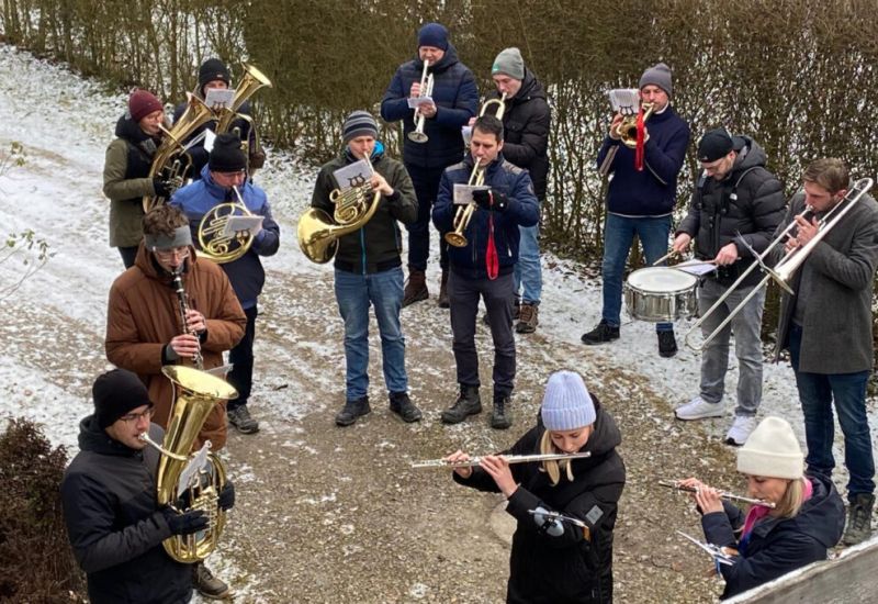 Hofs / Rotis – Wie es vielerorts der Brauch ist, so auch im Bereich der Pfarrgemeinde Hofs: Die örtliche Musikkapelle zieht von Haus zu Haus, von Weiler zu Weiler, um weihnachtliche Musikgrüße zu entbieten. Am 27. Dezember in der Frühe starteten die Musikanten in Rotis. Unser dort ansässiger Reporter Julian Aicher und seine Frau freuten sich sehr über das Ständchen. Und Julian griff sofort zur Kamera und sandte der Redaktionsleitung zwei Fotos und folgende Zeilen: