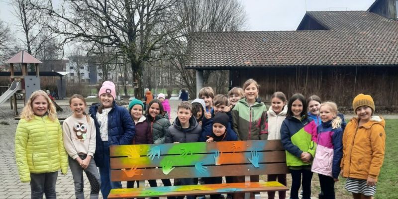 Grundschüler aus Reichenhofen gestalteten Parkbank zur Internationalen Woche gegen Rassismus