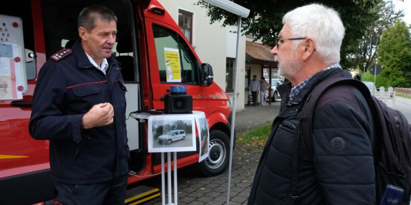 Bad Wuzach – Alljährlich am zweiten Donnerstag im September – in diesem Jahr also am 12. September – findet der bundesweite Warntag als gemeinsame Aktion von Bund., Ländern und Kommunen statt, an dem die Sicherheitseinrichtungen wie Sirenen getestet werden. Feuerwehrkommandant Rolf Butscher nutzte diese Gelegenheit, um auf dem Wochenmarkt das mobile Warngerät MOWACOM der Bad Wurzacher Feuerwehr der Öffentlichkeit vorzustellen.