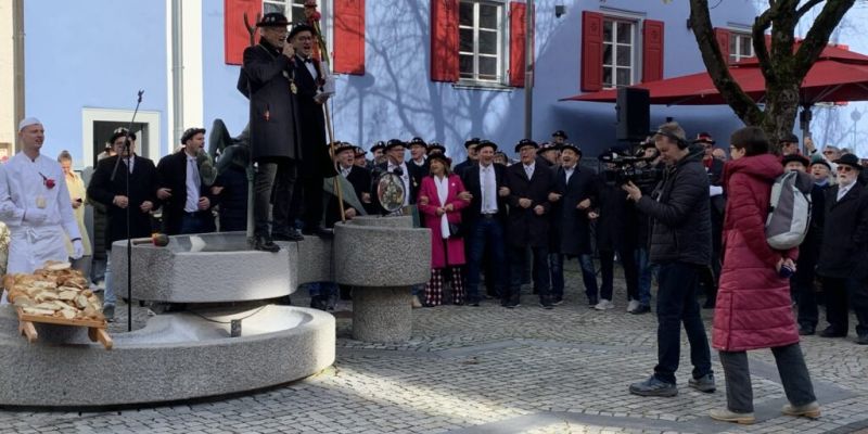 Bad Waldsee – Weil’s mit Riesenschritten „dagega goht“, begab sich Bäcker Herrmann bereits um zwei Uhr früh in die Backstube, um viele Meter Martinibrot zu backen. Tatsächlich war reichlich Zopf am Federlebrunnen auf der Hochstatt vorhanden, pünktlich vor dem Fasnetscountdown. Der dazugehörige strahlende Sonnenschein sei wie immer zuverlässig von Franzl Daiber organisiert worden und genauso werde das Wetter vom Gumpigen bis zum Fasnetvergraben sein, prophezeite Fasnetlader Ralph Zell („Zelli“…