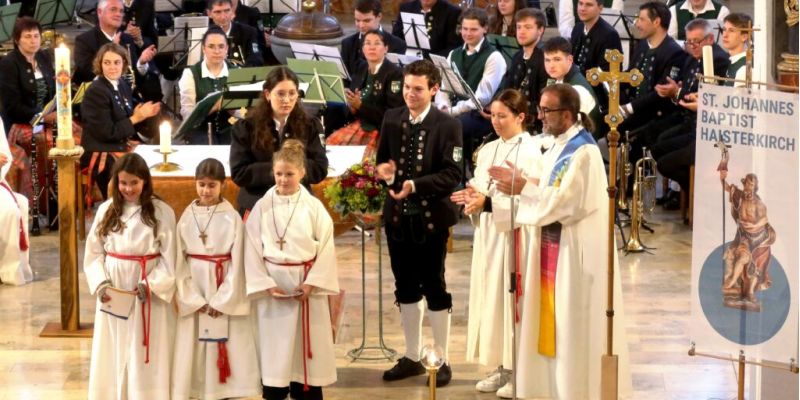 Haisterkirch – Am Freitagabend (21. Juni) war in Haisterkirch nicht nur ein festlich gestalteter Gottesdienst im Freien anlässlich des Patroziniums von St. Johannes Baptist geplant, sondern auch noch das Serenadenkonzert der Musikkapelle im Areal des Klosterhofs. Letzeres musste aufgrund des Dauerregens leider abgesagt werden. Dafür nahm die Musikkapelle unter musikalischer Leitung von Klaus Wachter Platz im Altarraum der Pfarrkirche, wo auch der Patroziniumsgottesdienst gefeiert wurde.