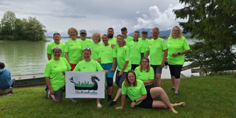 Bad Waldsee – 16 mutige Teilnehmer des Ruderverein Waldsee im Alter von 30 bis 76 Jahren meldeten sich unter dem Teamnamen „Stadtseedrachen Bad Waldsee“ an um ihren ersten Drachenbootwettkampf unter traumhafter Kulisse zu bestreiten.