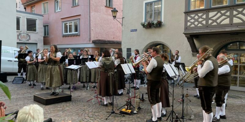 Leutkirch – Vergangenen Freitag, 7. Juni, hat sich das Wetter pünktlich zum Doppelstandkonzert der beiden Musikkapellen Gebrazhofen und Merazhofen von seiner besten Seite gezeigt. Viele Zuhörer und Freunde der Blasmusik waren gekommen und haben auf dem Leutkircher Marktplatz die tolle Atmosphäre eines Sommerabends genossen.