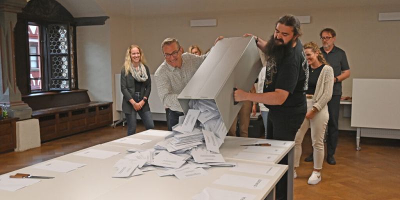 Bad Waldsee – Die Rathaus-Uhr schlägt sechs Mal. Eine Wahlhelferin bringt die letzten beiden Briefwahlkuverts aus dem Rathaus-Briefkasten. Ein weiterer nimmt den Brieföffner. Schlitzt die Kuverts auf. Prüft den Wahlschein. Alles ok. Die Wahlbriefumschläge kommen in die passenden Wahlurnen. Noch sind die Urnen verschlossen.