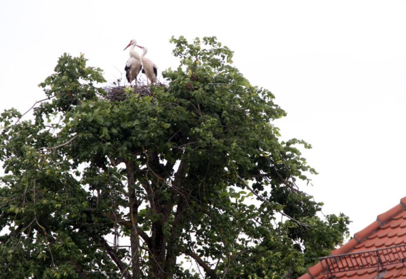 Auf dem Baum zwischen Kirche und Maria Rosengarten haben Störche sich ein Nest gebaut. Unser Fotograf Uli Gresser hat vom Eiscafé aus einen Blick hinübergeworfen.