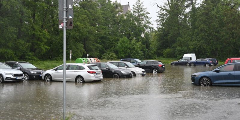 Bad Waldsee – Der endlos niederprasselnde Regen bescherte Bad Waldsee ein paar neue Seen. Der untere Teil des Bleicheparkplatzes ist fast vollständig überflutet. Wer sein Auto nicht rechtzeitig in Sicherheit brachte, ist gut beraten, sich hohe Gummistiefel anzuziehen, um sein Gefährt noch trockenen Fußes zu erreichen. Bürgermeisterin Ludy und Feuerwehrkommandant Burkhardt sind seit dem frühen Morgen im Einsatz und informieren sich vor Ort von der aktuellen Situation. Unser Reporter war …