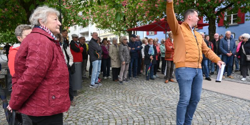 Bad Waldsee – Stadtspaziergang mit OB Matthias Henne und den Bad Waldseer Ü60ern am Dienstag, 6.5. Das Stadtoberhaupt hatte eingeladeb und mehr als 70 Seniorinnen und Senioren folgten Matthias Henne beim Spaziergang durch die Altstadt. Die Route ging vom neugestalteten Grabenmühlplatz über die Hochstatt zum Neuen Rathaus, auf dem Uferweg zum Spital und endete mit einem Erfrischungsgetränk nach gut einer Stunde im Sitzungssaal des historischen Rathauses.