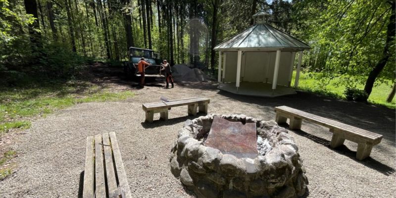 Bad Waldsee – Noch rechtzeitig vor dem 1. Mai und dem Beginn der Grillhüttensaison im Tannenbühl haben zwei städtische Waldarbeiter den gesamten Bereich um die Feuerstelle, den neuen Pavillon und vor der Grillhütte mit einem neuen Kiesbelag versehen. Insgesamt haben die beiden etwa 30 Tonnen Wegebaumaterial verteilt.