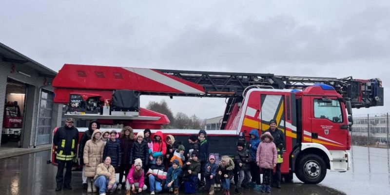 Bad Wurzach – Am Donnerstag, 1. Februar, machten sich 26 Schülerinnen und Schüler der Klasse 4b der Grundschule Bad Wurzach auf den Weg. Im Gepäck ein ordentliches Vesper und viele Fragezeichen rund um das Thema Feuerwehr. Begrüßt wurden die Kinder vom Feuerwehrkommandant Rolf Butscher und Pascal Schmehl, dem Leiter der Jugendfeuerwehr.