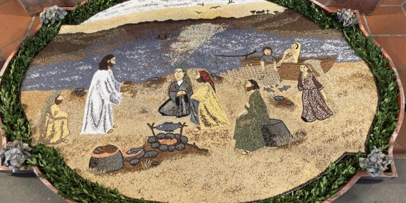 Kißlegg – Das Kißlegger Körnerbild zum Erntedankfest wurde von Birgit Uhl gestaltet. 65 Stunden hat sie dafür aufgewandt. Die Vorzeichnung stammt von Daniela Frick. Das vor dem Volksaltar der Kißlegger Pfarrkirche ausgelegte Körnerbild zeigt den Fischfang am See Genesareth. Die Jünger begegnen Jesus, der am Ufer ein Kohlefeuer für sie gemacht hat (Joh 21). Foto: Margit Reischmann