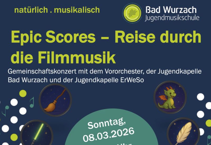 Bad Wurzach – Zwei Jugendkapellen, ein gemeinsames Projekt und fast 100 Jugendliche auf einer Bühne: Am 8. März um 17.00 Uhr laden die Jugendkapelle der Jugendmusikschule Bad Wurzach unter der Leitung von Eva Oberleiter und die ErWeSo-Jugendkapelle aus dem Raum Erkheim/Sontheim unter der Leitung von Rainer Wörz zu einem besonderen Filmmusikkonzert ins Kurhaus Bad Wurzach ein.