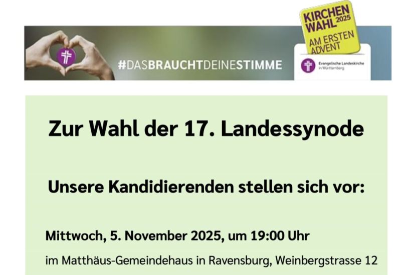 Ravensburg – Im November gibt es im Wahlbezirk Ravensburg/Biberach einige Termine, um die Kandidierenden für die Evangelische Landessynode kennenzulernen. Unter Downloads finden Sie das Plakat mit den Terminen und Orten.