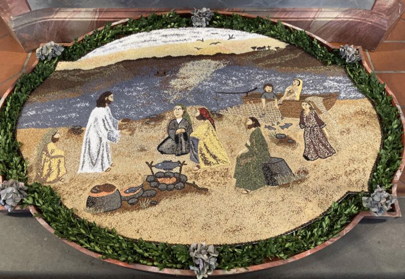 Kißlegg – Das Kißlegger Körnerbild zum Erntedankfest wurde von Birgit Uhl gestaltet. 65 Stunden hat sie dafür aufgewandt. Die Vorzeichnung stammt von Daniela Frick. Das vor dem Volksaltar der Kißlegger Pfarrkirche ausgelegte Körnerbild zeigt den Fischfang am See Genesareth. Die Jünger begegnen Jesus, der am Ufer ein Kohlefeuer für sie gemacht hat (Joh 21). Foto: Margit Reischmann