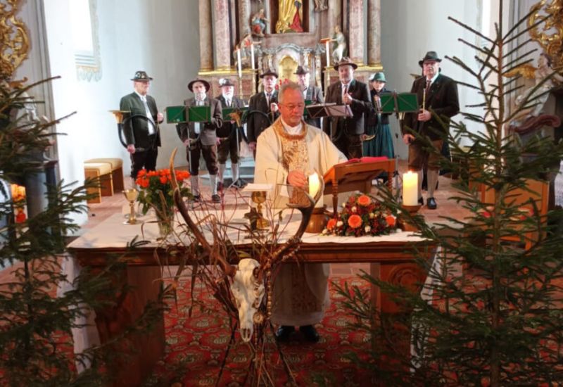 Rötsee – Gut besucht war die Hubertus-Messe in Rötsee am Sonntag, 9. November. Es zelebrierte Pfarrer Vitus Graf von Waldburg-Zeil. Die Jagdhornbläser Wolfegg umrahmten den Gottesdienst mit ihren Weisen.