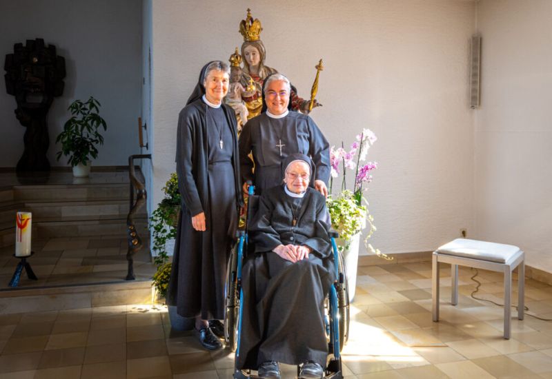 Bad Waldsee-Reute – An ihrem 100. Geburtstag war die Jubilarin gut gelaunt und strahlte, als sie zusammen mit Generaloberin Sr. Maria Hanna und Konventsoberin Sr. Mirjam zum Fototermin kam. Sr. M. Sermata Frank feierte am 1. Oktober ihren 100. Geburtstag im Kloster Reute. 1953 ist sie in den Orden eingetreten, 1955 legte sie ihre Profess ab. Heute lebt sie im Gut Betha Haus, dem Alten- und Pflegeheim des Klosters.