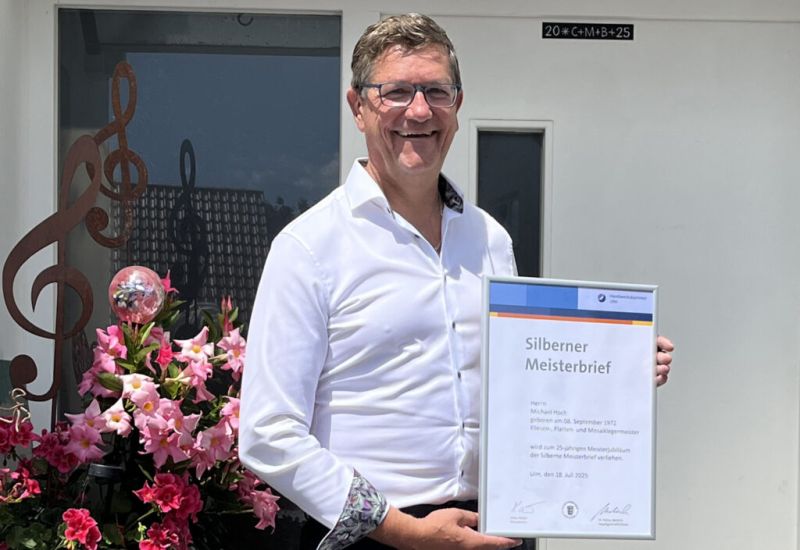 Bad Wurzach-Arnach – Die Handwerkskammer Ulm stattete kürzlich Fliesen-, Platten- und Mosaiklegermeister Michael Hoch einen Besuch ab und überreichte dem Jubilar den Silbernen Meisterbrief für 25 Jahre Engagement und Treue im Handwerk.